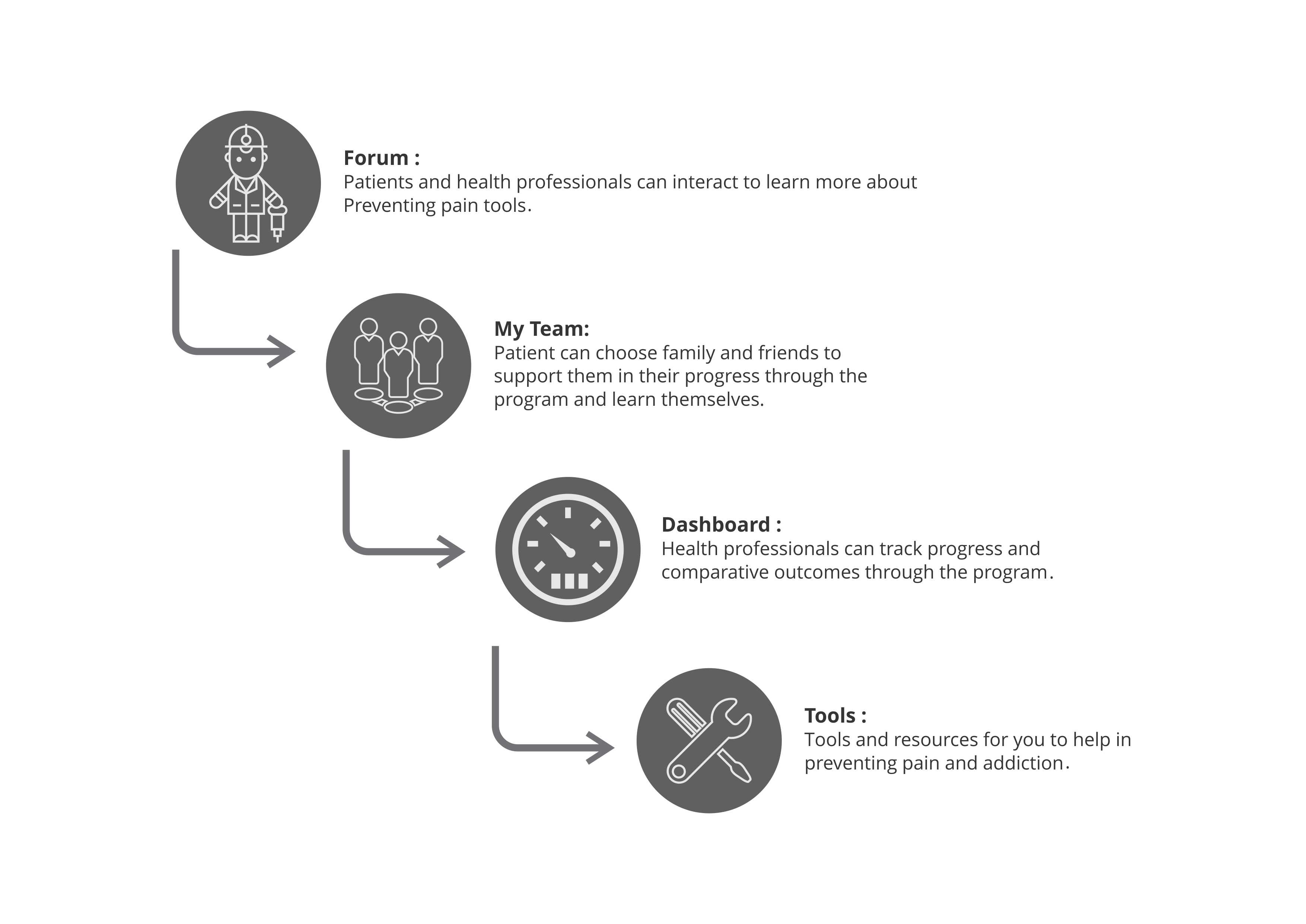 The patient dashboard documents patient engagements and progress, tracks comparative outcomes of pain, interference, health care use, and adverse events.